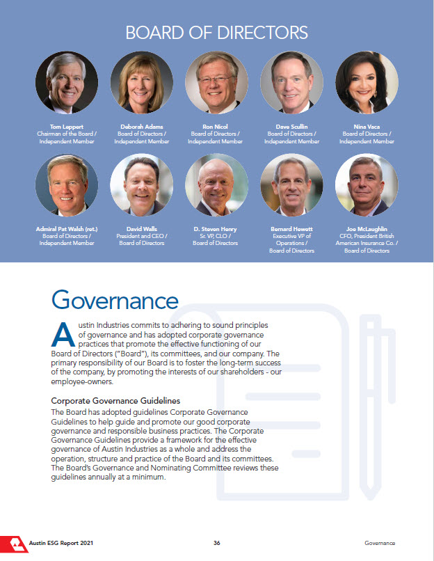Austin Industries commits to adhering to sound principles of governance and has adopted corporate governance practices that promote the effective functioning of our Board of Directors (“Board”), its committees, and our company. The primary responsibility of our Board is to foster the long-term success of the company, by promoting the interests of our shareholders - our employee-owners.